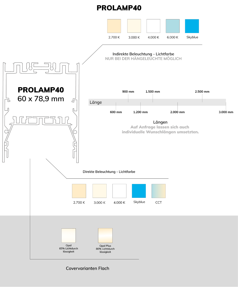 Für Ihr spezielles Projekt bieten wir auf Anfrage eine individuelle Farbwahl für das lineare Leuchtenprofil an. So erhalten Ihre Räumlichkeiten eine einzigartige Note, die präzise auf Ihre architektonischen Anforderungen abgestimmt ist.