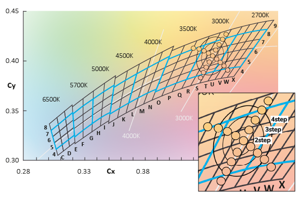 ANSI Cree Chart: Zu den Standardfarben bei ISOLED® gehören Utra -Warmweiß, Warmweiß (2700 K), Warmweiß (3000 K), Naturweiß (4000 K), Kaltweiß (5500 K)