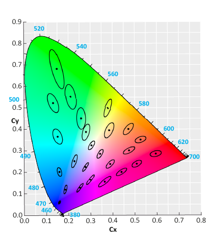 Das CIE Normvalenzsystem ist ein Standard zur objektiven Beschreibung von Farben und ihrer Wahrnehmung durch das menschliche Auge. Anhand der MacAdam-Ellipsen wird die Toleranz und Genauigkeit der Farbwiedergabe definiert. Je kleiner der Bereich innerhalb der MacAdam-Ellipse, desto geringer sind die Farbunterschiede, die vom menschlichen Auge wahrgenommen werden können.