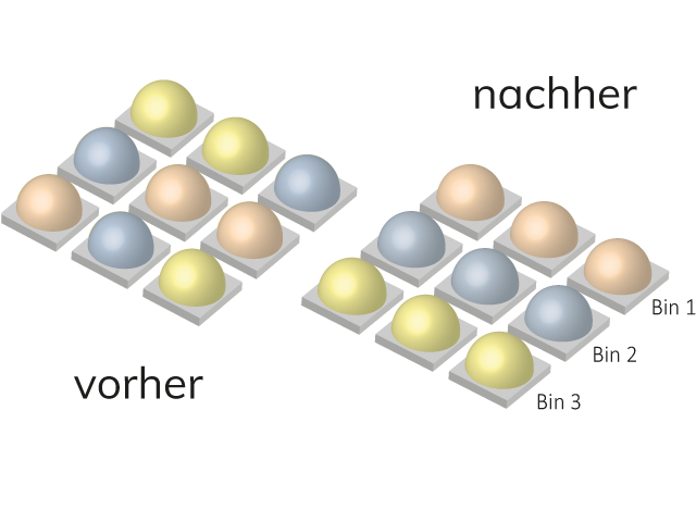 Jeder LED-Chip weist geringfügige Abweichungen in Lichtstrom, Farbwert und Durchlassspannung auf. Durch das Binning-Verfahren werden diese Chips nach ihrer Qualität kategorisiert. Auf diese Weise können sie gezielt in LEDLeuchtmitteln verbaut werden, um eine gleichbleibende Lichtqualität