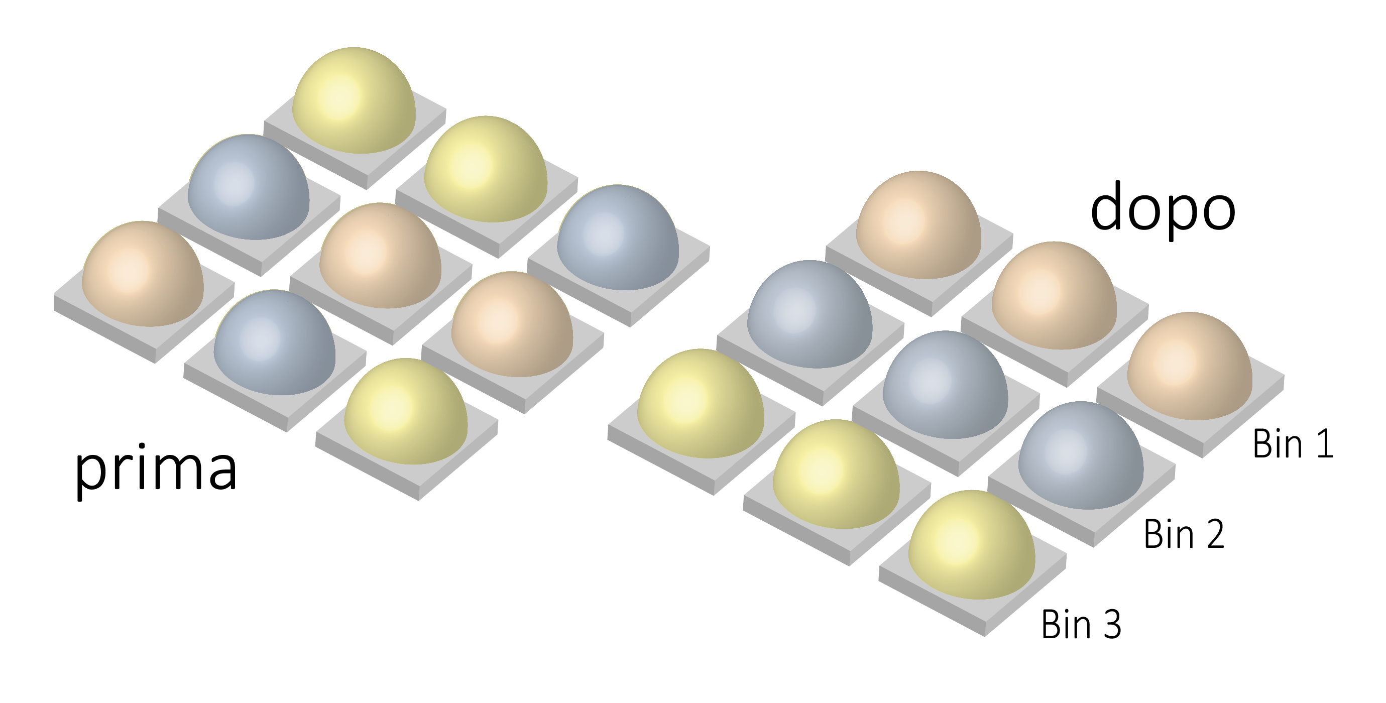 I chip LED di ogni lotto di produzione hanno deviazioni in termini di flusso luminoso, valore di colore e tensione diretta. Il binning è il processo con cui i produttori di LED valutano i singoli chip LED e li classificano in bins.